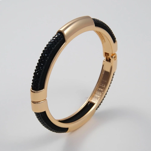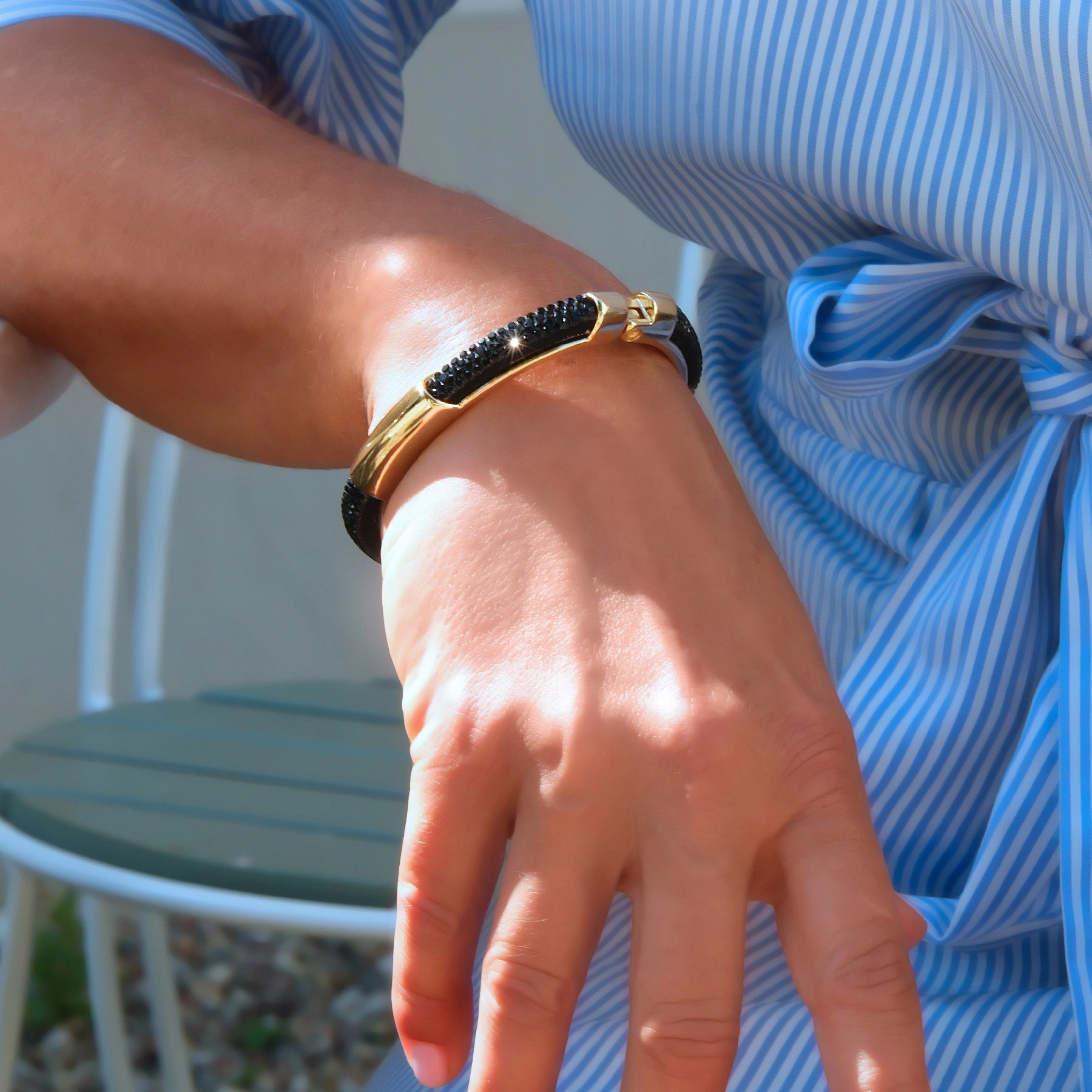 Sztywna złocona bransoletka z czarną połyskującą gumą