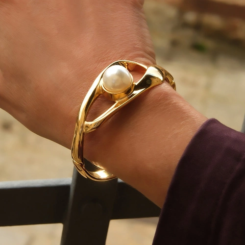 Sztywna złocona bransoletka z perłą słodkowodną. KANON PIĘKNA