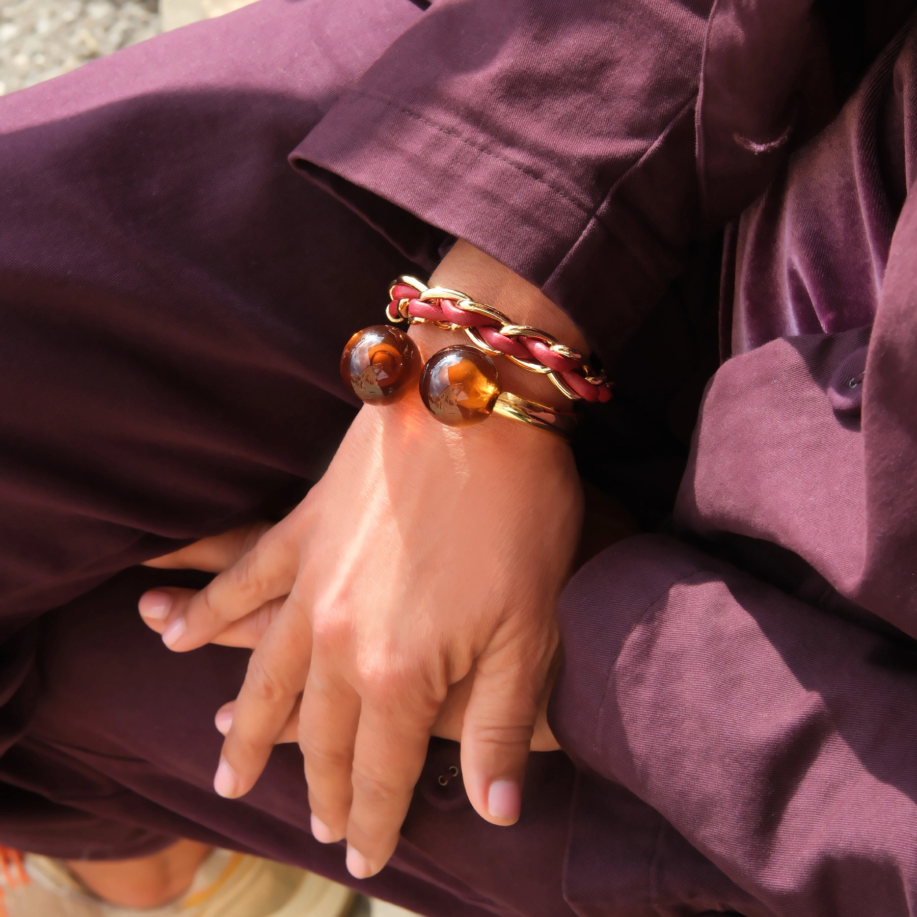 Sztywna złota bransoletka z dwiema brązowymi kulami