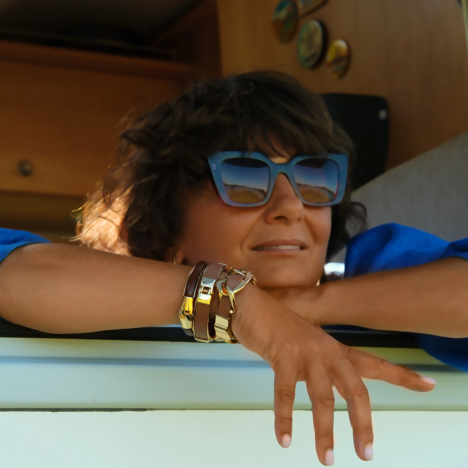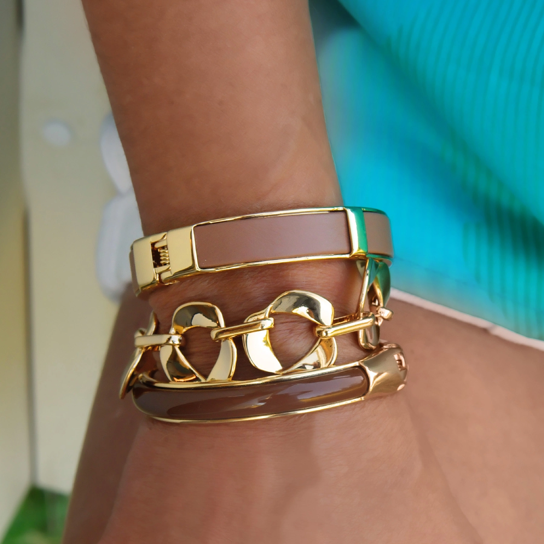 • Sztywna bransoletka wykonana z pozłacanego znalu - stopu lekkich i nieuczulających metali, z akrylowym dekorem w kolorze mokka, z mechanizmem sprężynkowym ułatwiającym otwarcie i zapięcie. Rękodzieło brazylijskiej projektantki.