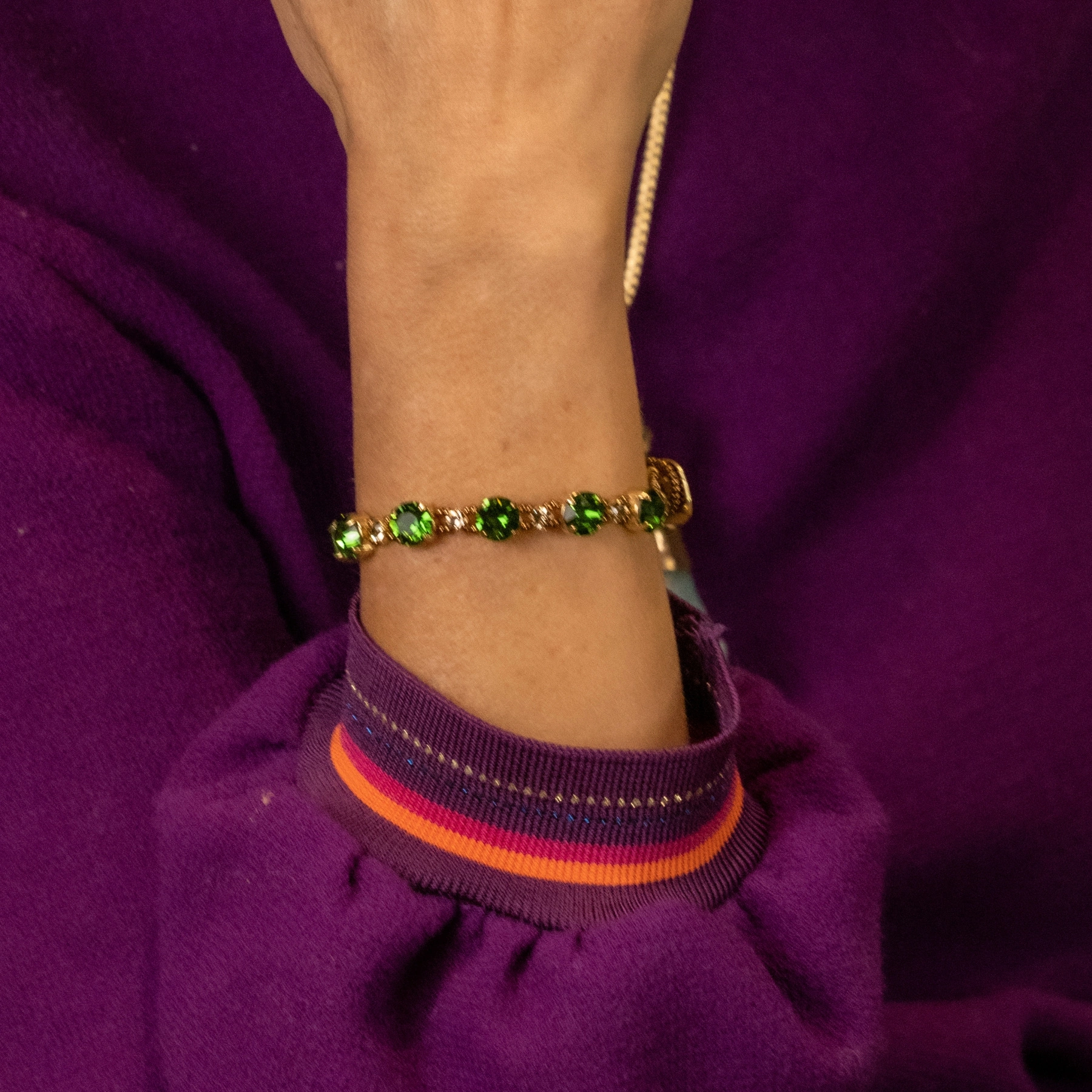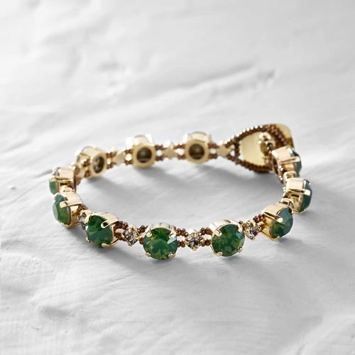 • Bransoletka na żyłce ze szmaragdowych i przezroczystych kryształów Swarovskiego w oprawach z mosiądzu platerowanego złotem i koralików z tego samego materiału. Rękodzieło z pracowni w Sao Paulo.