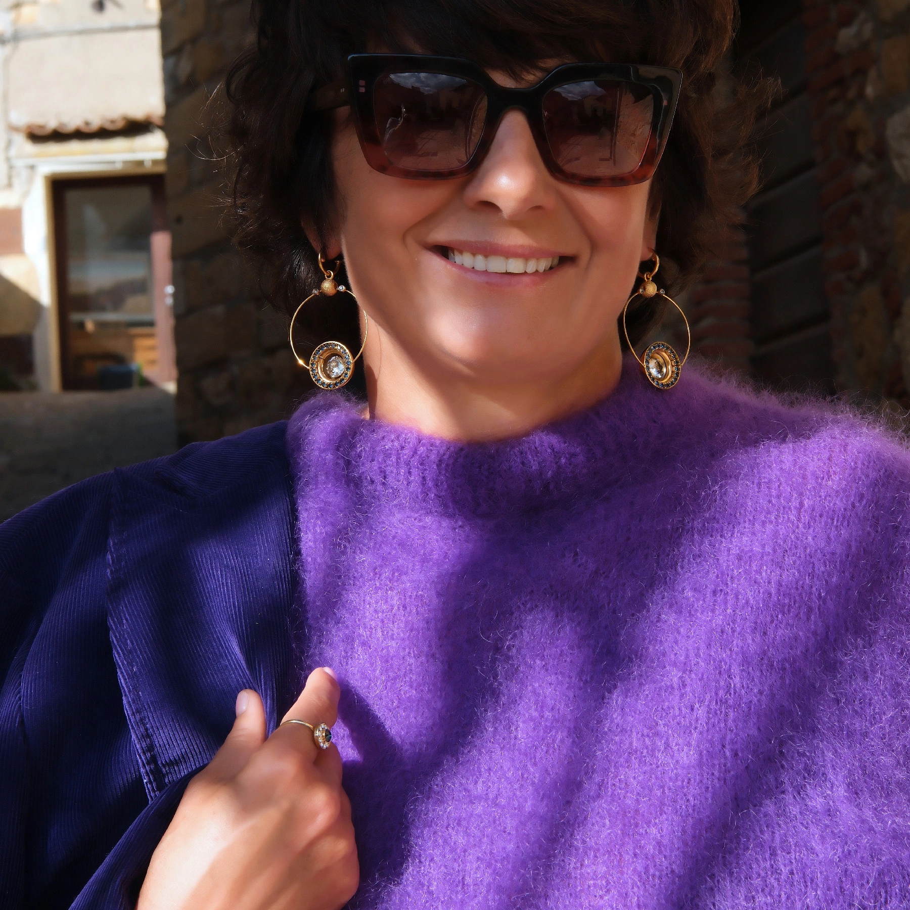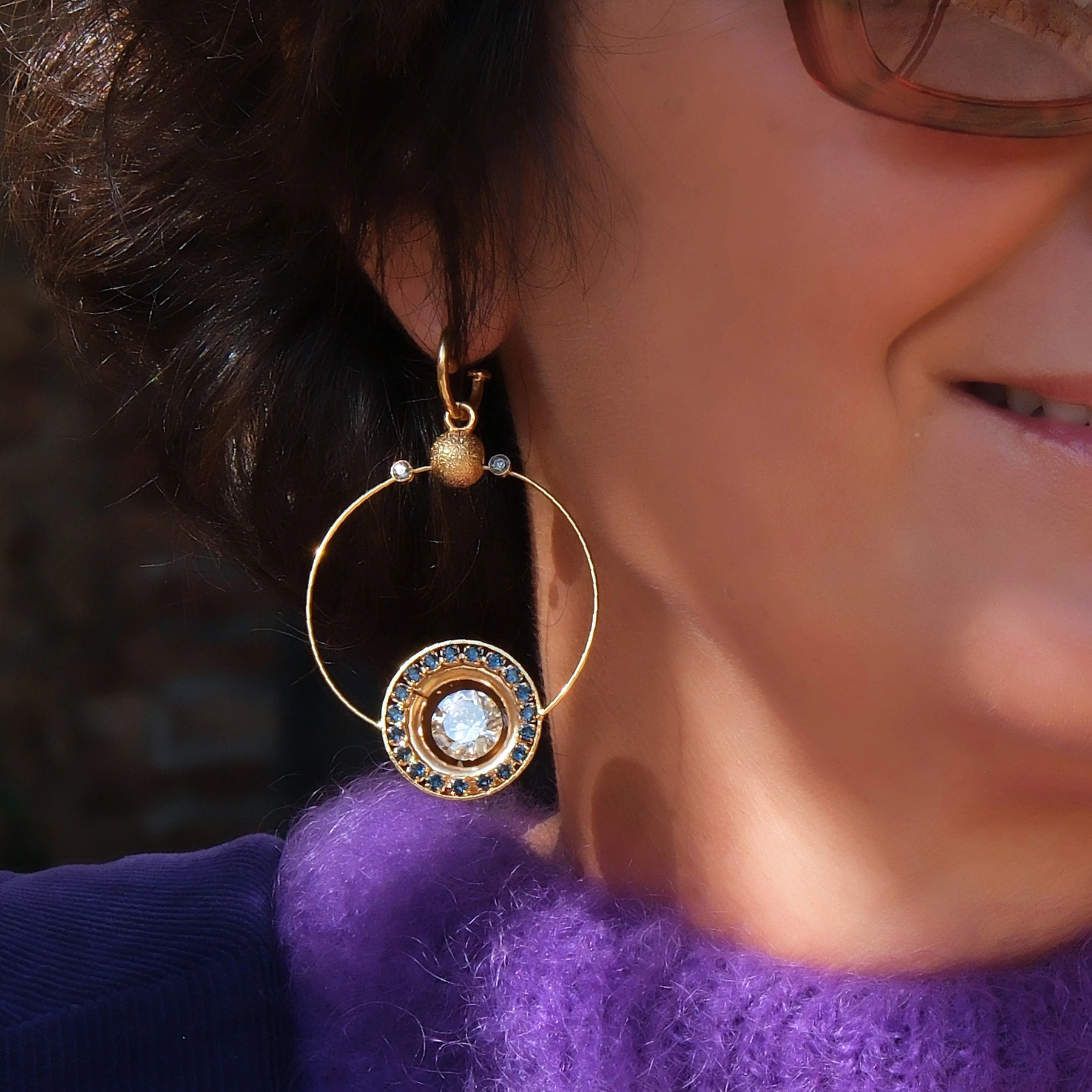 Złocone kolczyki koła z białym i niebieskimi kryształami