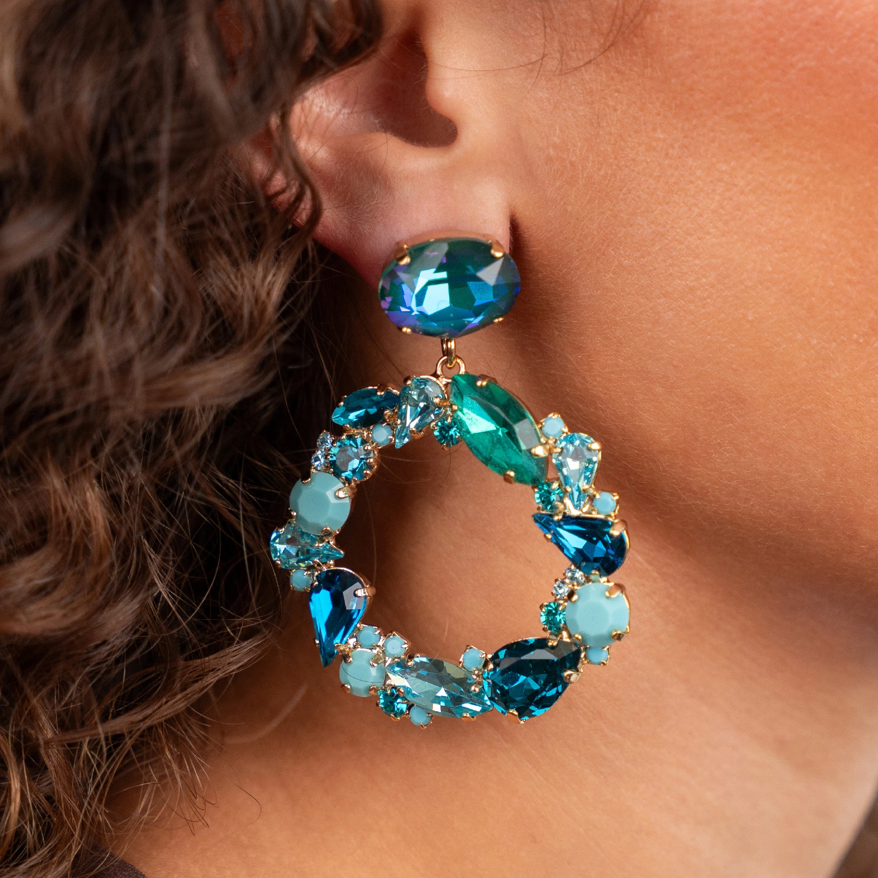 Złocone kolczyki z kryształów w niebieskich odcieniach