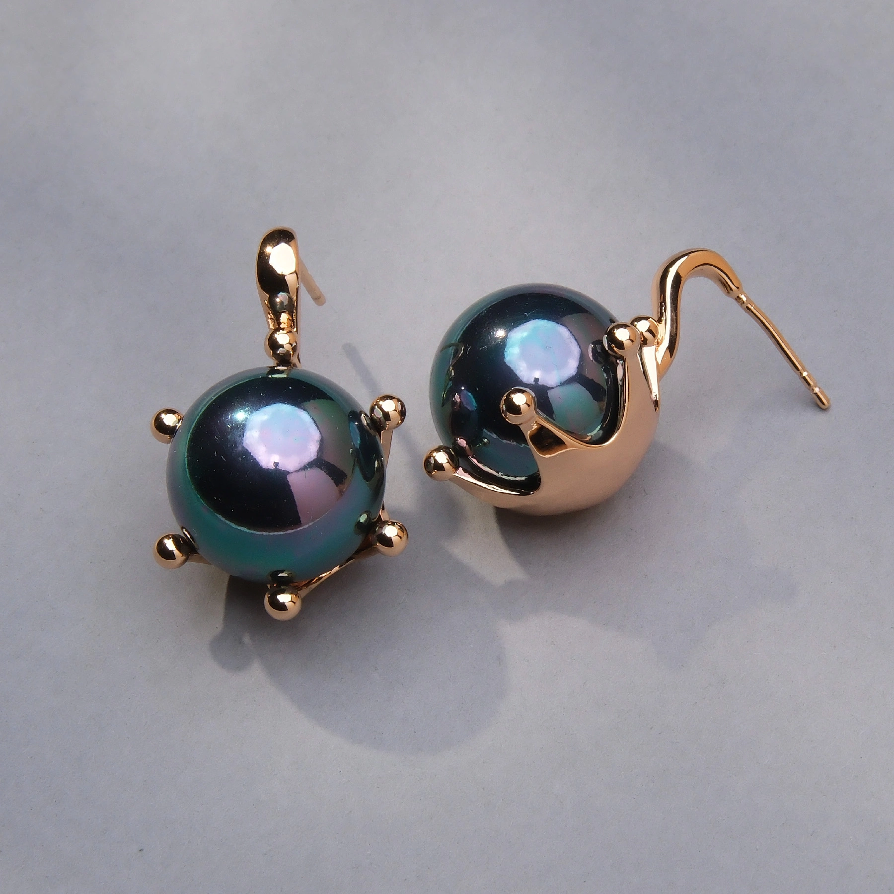 Złocone kolczyki z szklanymi perłami w kolorze petrol