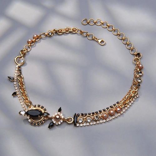Złocony naszyjnik na łańcuchach z kryształkami i perłami