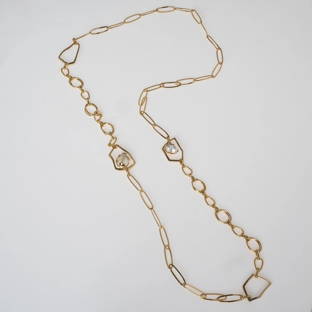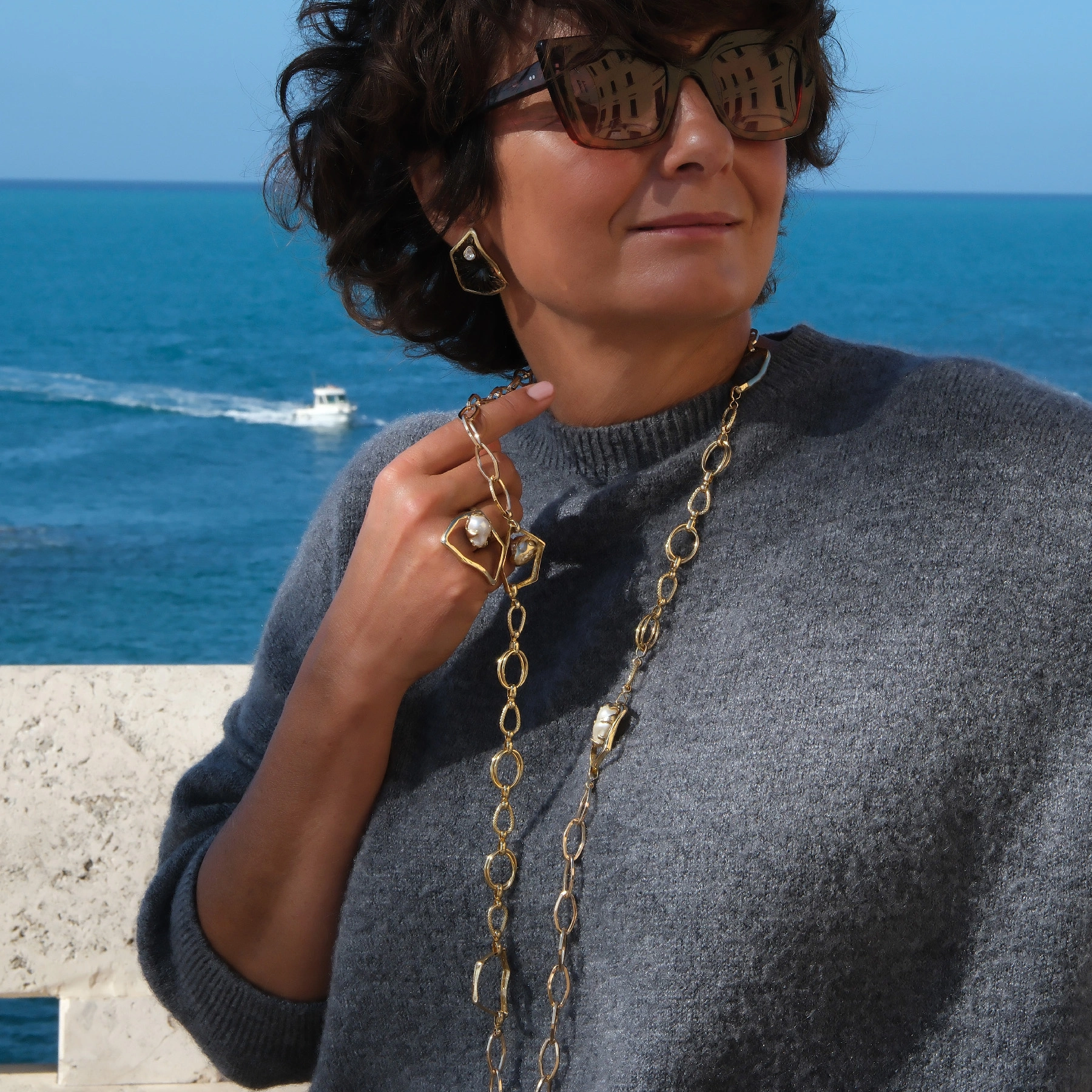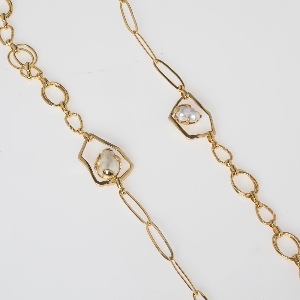 Złocony naszyjnik na łańcuchu z trzema dekorami i perłami