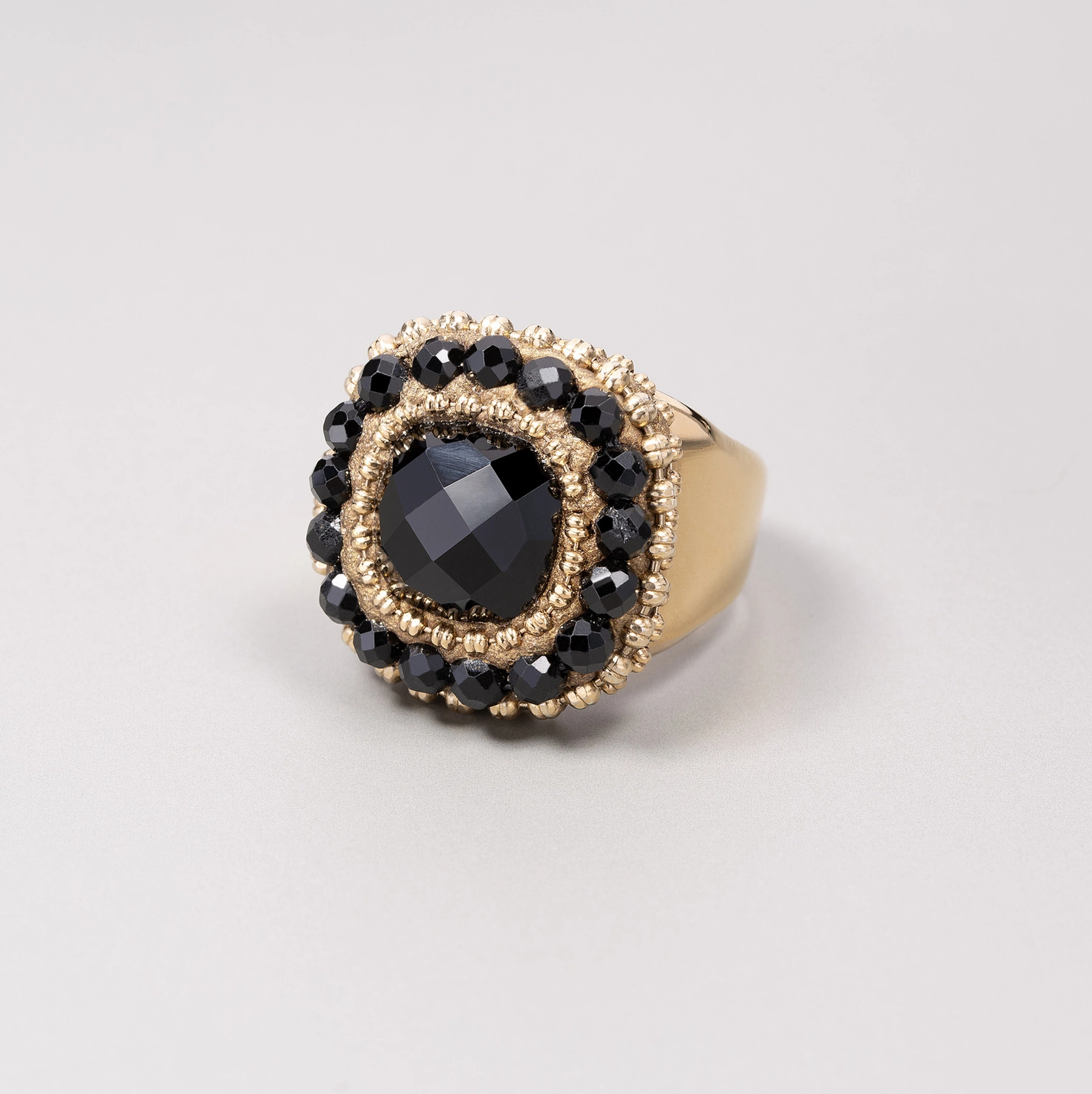 Zlocony pierścień z czarnymi kryształami i łańcuszkami