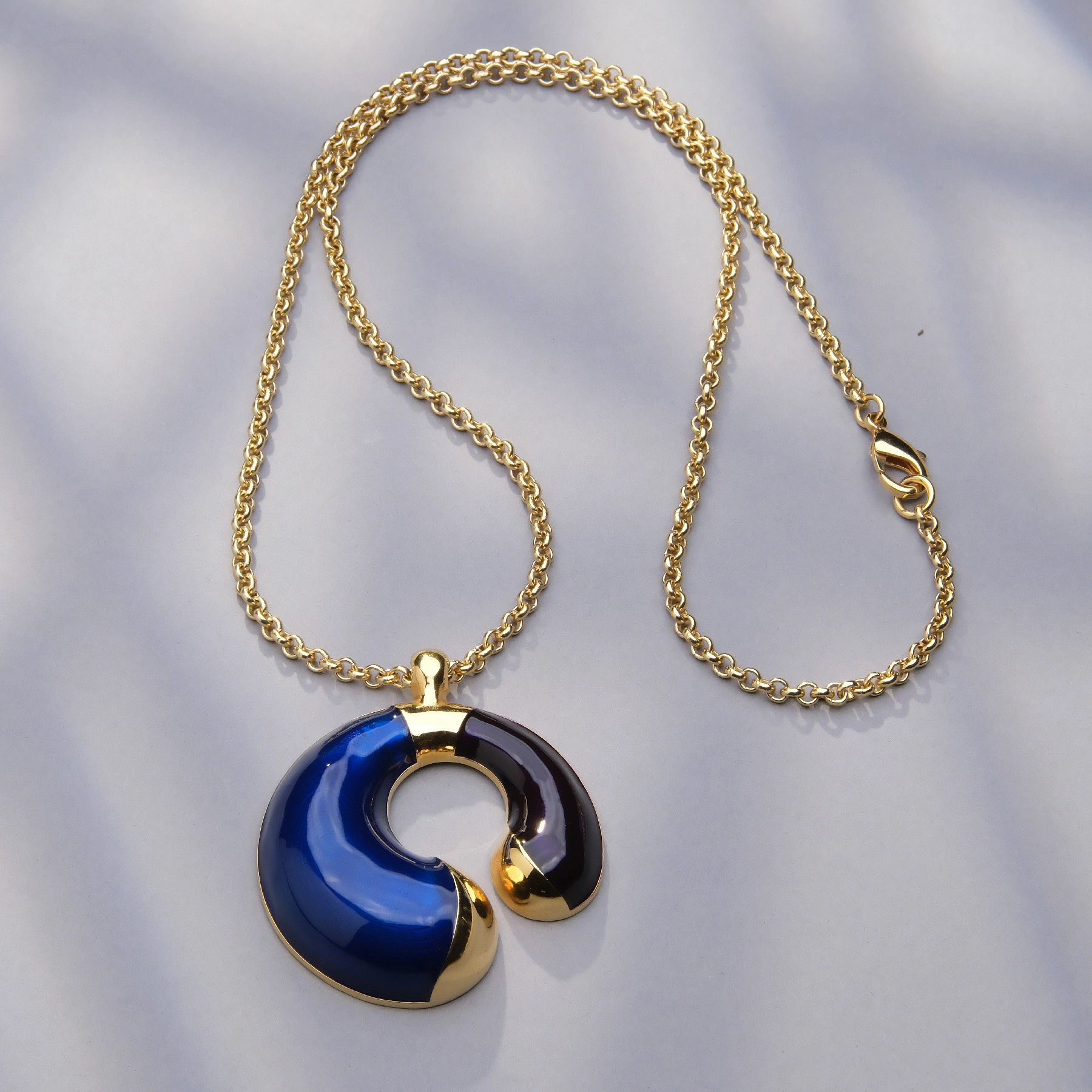 Złocony wisior z emaliowaną na granat i brąz zawieszką