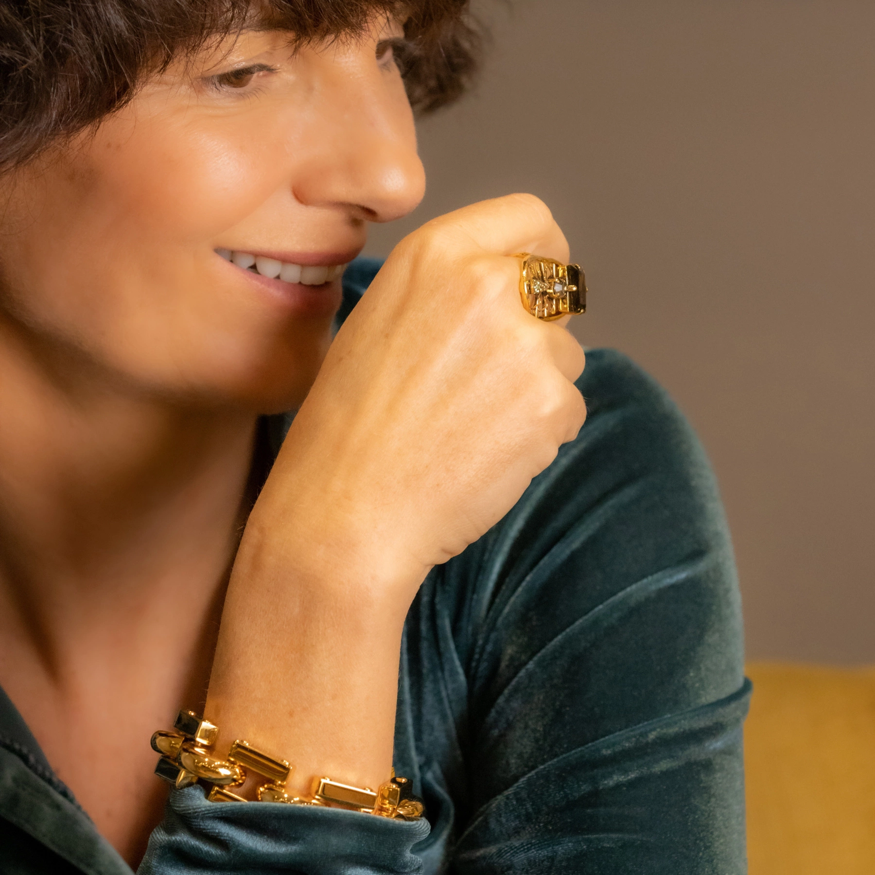 • Industrialna i nowoczesna forma. Bransoletka łańcuch z pozłacanego stopu metali – cynku oraz aluminium – dzięki czemu jest lekka w noszeniu. Zapinana na magnes. Wzmacnia optycznie nadgarstek i czujesz się w niej świetnie!