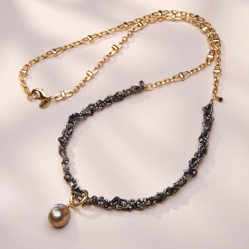 Złocony naszyjnik z pirytami, hematytami i barokową perłą